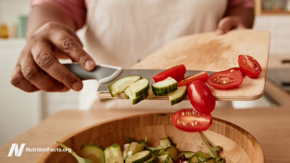 The bottom line is it’s never too late to turn back the clock. A midlife switch just to the basics—at least five daily servings of fruits and vegetables, walking 20 minutes a day, not smoking, and maintaining a healthy weight—leads to a substantial reduction in mortality even in the following few years. We’re talking a 40% lower risk of dying in the subsequent four years. Indeed, “making the necessary changes to adhere to a healthy lifestyle is extremely worthwhile, and…middle-age is not too late to act.”